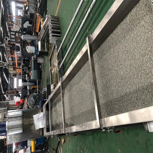 JDL-95D雙螺桿----——JDL-250單螺桿擠出機(jī)————水環(huán)磨面熱切機(jī)頭----—離心脫水機(jī)---——-2.5m加長(zhǎng)振動(dòng)篩----—成品料倉(cāng)------主機(jī)采用:PLC控制 。加工物料:管道料改性造粒 PE波紋管改性造粒 產(chǎn)能:23-25噸/24小時(shí)(注意事項(xiàng):取決于客戶的配方、工藝、生產(chǎn)條件)